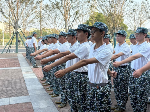 一令一动,步履铿锵铸军魂。“齐步——走!”口令声落,脚步声起。训练场上,同学们目光如炬,身姿挺拔,在教官们一丝不苟的指导下,从摆臂的定位、步幅的精准到排面的整齐,每一个细节都经历了千锤百炼。手臂划过空气的唰唰声、脚跟落地的哒哒声,与铿锵的口令交织成严格的韵律。阳光炙烤着皮肤,汗水沿着帽檐滑落,但没有人轻言放弃。一次次重复,一遍遍纠正,同学们眉宇间的稚气逐渐褪去,慢慢浮现出军人般的坚毅与专注。那整齐划一的方阵,不仅仅是动作的协调,更是意志的凝聚与集体精神的生动写照。