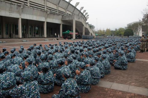 10月16日14时30分,中南大学军训四营2025级新生全营会操在潇湘校区体育场外场举行。5个连队依次接受营长孙嘉伟检阅,各排长协助连长维持现场纪律。